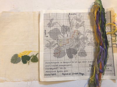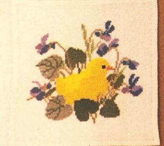 クララ・ウェ―バ― ひよことすみれのデザイン 16x16cm クロスステッチ刺繍用麻地、刺繍糸15色、 チャートのキットです。