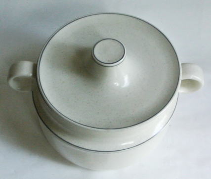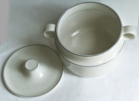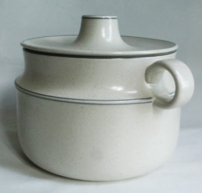 リンドベリの後期のデザインBirka、黒のラインは手描き クリーム色とグレーのニュアンスの白色に極ちいさな点々がはいったストーンウェアのキャセロール リンドべりらしい美しいフォルムデザイン