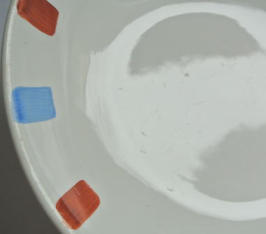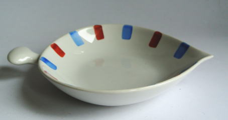 耐熱のGefyr Martaシリーズ、うつくしいフォルムの葉っぱ型プレートに赤と青の短いラインがハンドペイントされています、お料理やオードブルをきれいに盛り合わせて使いたいですね、、、