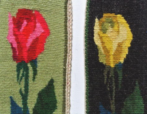 スウェーデンのフレミッシュ織り 黄バラと赤バラ 花や葉の色のグラデーションがきれいに織られた作品です