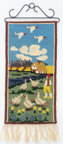 ルーラーカン織で織られたニルスの不思議のニルスとガチョウ フレミッシュ織りとは違った魅力のある作品です。