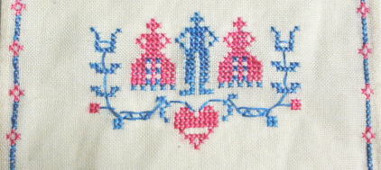 ピンクとブルーのクロスステッチ刺繍のドイリー
