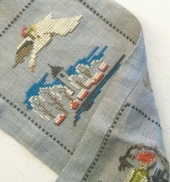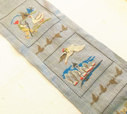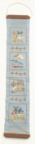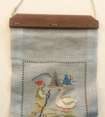 が刺繍されたかわいらしいタペストリーです、、、4種の場面が刺繍されています。切り替え部分のガチョウの刺繍もよいですよね、、