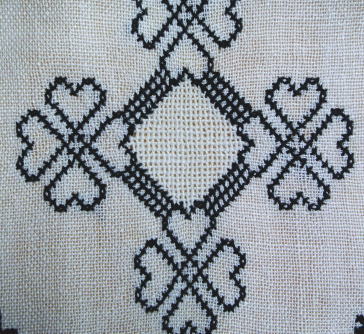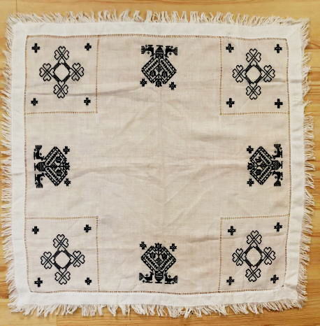 SVARTSTICKはダーラナ地方刺繍とよべるほどダ−ラナ地方に根付いた刺繍法でたくさん時間と(細かい仕事なので)良い目を必要とする刺繍法です。一瞬シンプルに見えますが大変な手間と時間をかけられた作品です。KORSSTYGN,RUTSOM,RATTLINJIG,PLATTSOMの刺繍方法が使われます。(HANDARBETSBOKENより)こちらのテーブルクロスは薄手の生地に小さな小さなステッチとホールソムでたくさんの時間を費やして刺繍された作品です 小ぶりのサイズでまわりはフリンジ仕上げになっています
