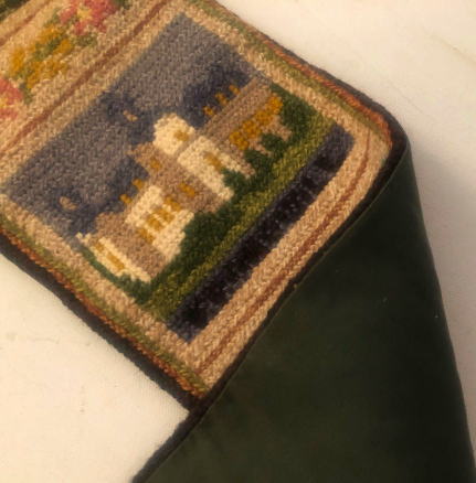 スウェ―デン南部スコーネ地方にあるお城がモティ−フになったロングサイズのトゥヴィスト刺繍のタペストリーです。、ドイツの古城のような豪華なお城ではなく、これがお城?と思うような素朴な北欧らしいところが多いのです。真鍮製のベルプル金具がついています。