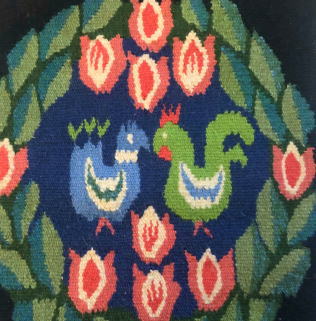 チューリップと葉のリースと2羽の小鳥のモティ−フのフレミッシュ織 タペストリーとして仕上げられています。