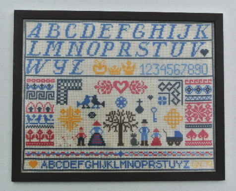 クロスステッチ刺繍サンプラー アルファベット 数字 民族衣装を着た人 動物や木 鳥など北欧らしいモティーフが丁寧に刺繍されています、、、プロの手によって額装されたもので木製 表面にはガラスが入っています。
