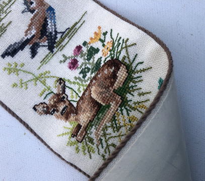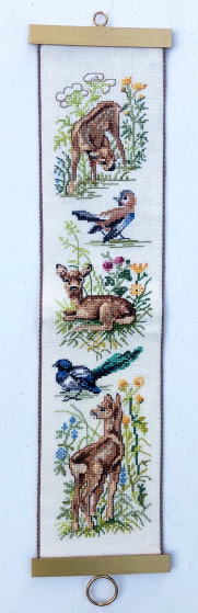 動物やことりの刺繍が美しいEva Rosenstandのタペストリーです、小ぶりのサイズで真鍮製のベルプル金具がついています